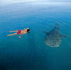 The thick skin of the whale shark is darkly blue-grey and shows a drawing of yellowish-white spots and vertical lines on the head, back and the flanks. The skin can show injuries in particular from propellers of ships. The eyes are small, the large mouth, however, has a width of up to two meters. The aperture of the broad mouth, having some tooth lines, is not below, but in front. With its mouth which is enable to chew or to bite, the fish sucks sea water in huge quantities. Gill weirs filter primarily plankton, but also shrimps, anchovies, crabs and sometimes little fishes out of water. The whale shark has two pectoral fins in gill height and two dorsal fins. The caudal fin is enormous and protrudes out of water, if the animal is near the surface of water. Sightseeing