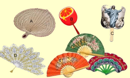 Hand fans In the Philippines people suffer very often from a stagnant hot humid air and they would give a kingdom for a fresh, cool wind breeze. Such one enjoying an air condition or electrical ventilator can consider himself lucky. But they are not on each place available. Then each broader, flat surface like a folded newspaper can be helpful. However, it is questionable if a folded newspaper produces so much fresh air like a better fan. Fans have an ancient historical tradition. Already the old Egyptians fanned out their rulers fresh air with giant fans. The Chinese also can look back on a long fan-tradition. They developed many types fan with partly sophisticated technology and beautiful decorations. In Europe the fan had its prime time particularly in the Rococo period. It was an indispensable equipment for the aristocratic ladies of this time. Today hand fans are in the northern countries "out of fashion". If we see it right, only the fashion monger Karl Lagerfeld tries to give his hollow words more importance by waving a hand fan. The situation in the Philippines is very different. Hand fans, sometimes also called “abanikos” can be found like brooms almost in every household. It is also used by men. The following picture shows some of the fans, which can be found on the Philippines: